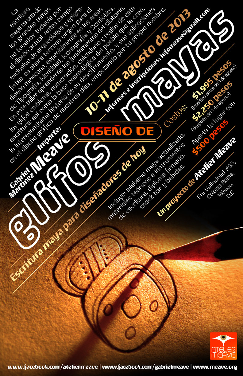 Diverse posters to promote Calligraphy, Illustration and Design workshops by G.M.Meave, under the business name Atelier Meave. The angled design, as well as especially crafted photos and drawings, have come to define a sort of «design identity» for the whole project, while being flexible enough to accomodate very different subjects.