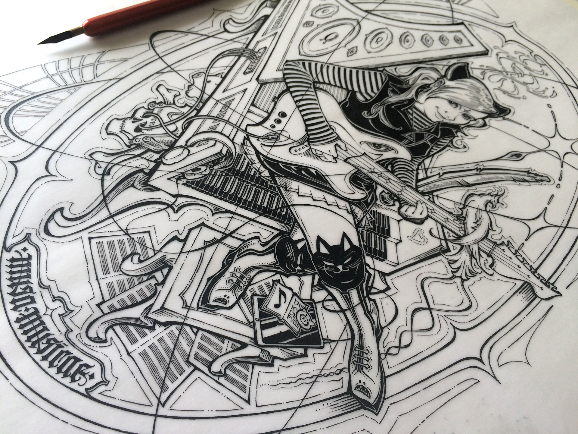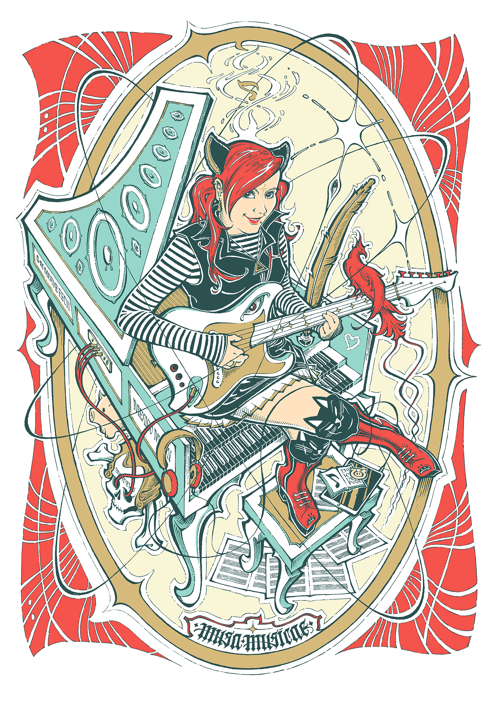 A personal illustration project, on the theme of the Muse of Music. Here I show the final colour artwork, the previous ink drawing and the original pencil sketch.