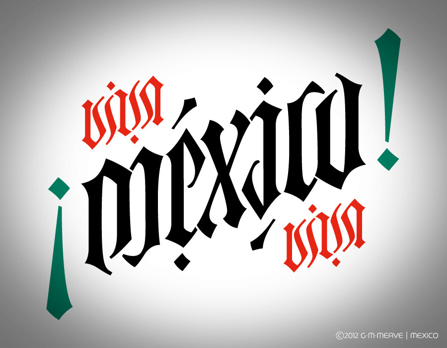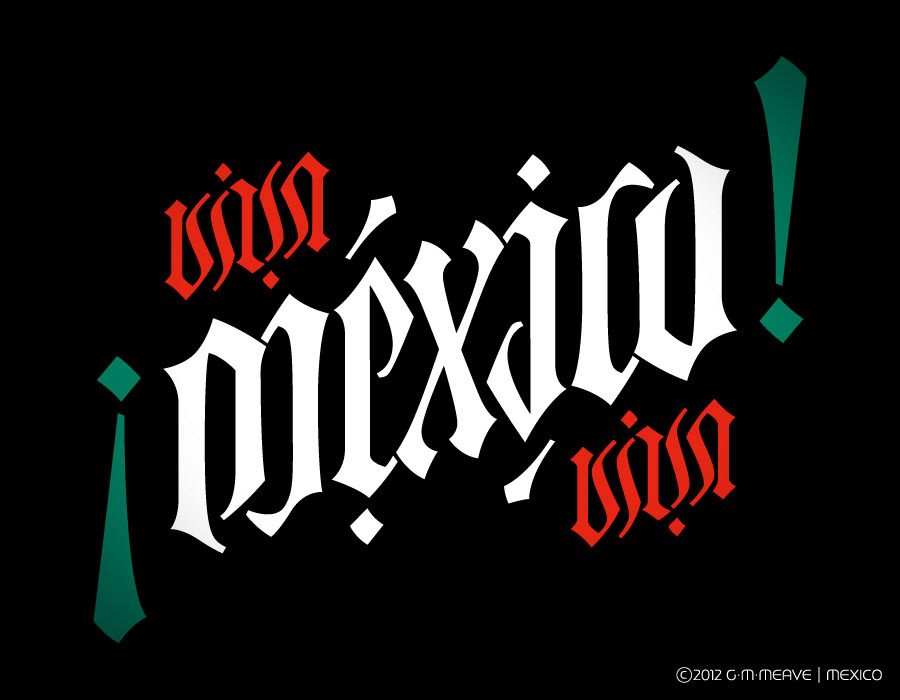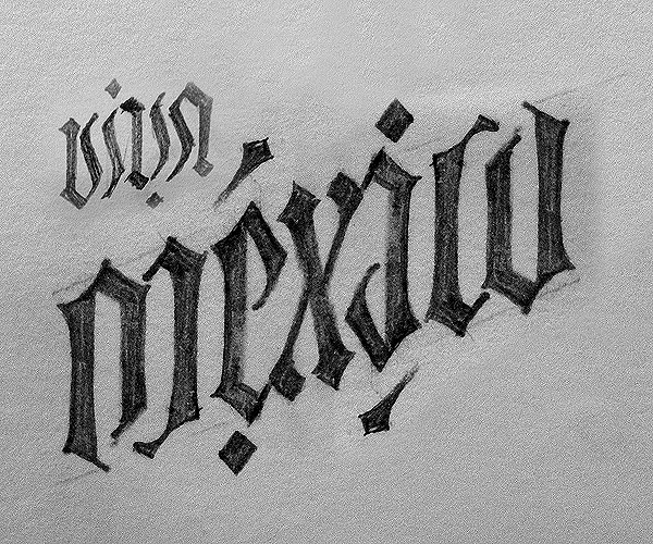 A Gothic-lettering inspired ambigram, celebrating México’s Independence Day on September 16th. Here I show sketches, vector work and finished art in positive and negative versions. You may rotate the image so you can see the full effect.